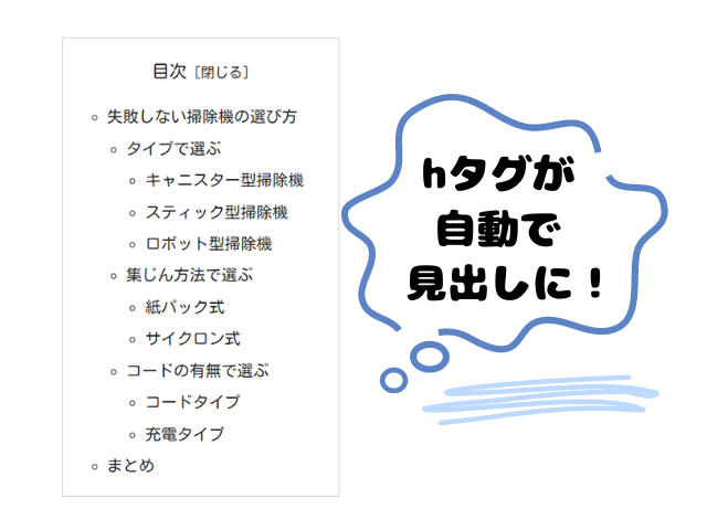 さらに、Wordpressを使用したブログでは、hタグの内容が「目次」へと自動で反映されます。