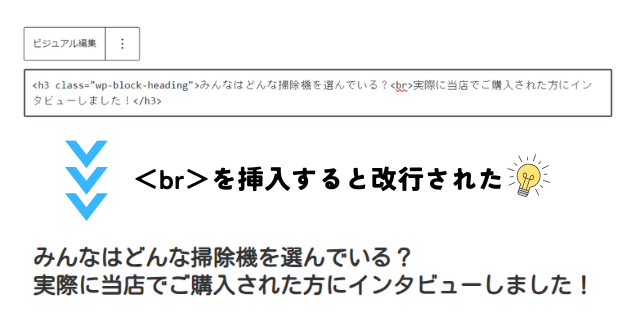 見出しが長くなり、読みづらい場合には、以下のように<br>タグを使うことで、改行が可能です。